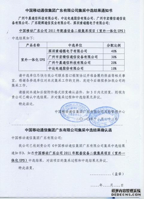 UPS大型制造商及UPS专业解决方案专家——芒果体育官方网站,以绝对的厂商实力、专业快捷的售后服务在中国移动广东公司2011年集采入围项目中以最大份额中标。